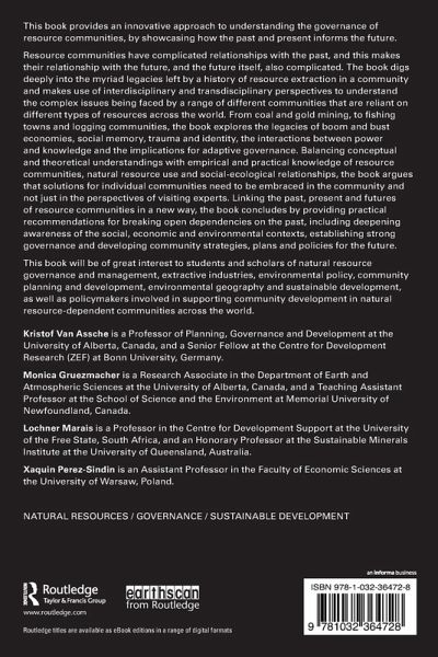 Resource communities have complicated relationships with the past, and this makes their relationship with the future, and the future itself, also complicated. The book digs deeply into the myriad legacies left by a history of resource extraction in a community and makes use of interdisciplinary and transdisciplinary perspectives to understand the complex issues being faced by a range of different communities that are reliant on different types of resources across the world. From coal and gold mining, to fishing towns and logging communities, the book explores the legacies of boom and bust economies, social memory, trauma and identity, the interactions between power and knowledge and the implications for adaptive governance. Balancing conceptual and theoretical understandings with empirical and practical knowledge of resource communities, natural resource use and social-ecological relationships, the book argues that solutions for individual communities need to be embraced in the community and not just in the perspectives of visiting experts. Linking the past, present and futures of resource communities in a new way, the book concludes by providing practical recommendations for breaking open dependencies on the past, including deepening awareness of the social, economic and environmental contexts, establishing strong governance and developing community strategies, plans and policies for the future.
