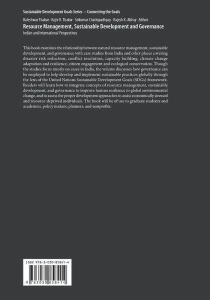 This book examines the relationship between natural resource management, sustainable development, and governance with case studies from India and other places covering disaster risk reduction, conflict resolution, capacity building, climate change adaptation and resilience, citizen engagement and ecological conservation. Though the studies focus mostly on cases in India, the volume discusses how governance can be employed to help develop and implement sustainable practices globally through the lens of the United Nations Sustainable Development Goals (SDGs) framework. Readers will learn how to integrate concepts of resource management, sustainable development, and governance to improve human resilience to global environmental change, and to assess the proper development approaches to assist economically stressed and resource-deprived individuals. The book will be of use to graduate students and academics, policy makers, planners, and nonprofits.