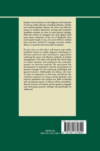 Despite recent advances in the diagnosis and treatment of various cardiac illnesses, including ischemic, valvular and cardiomyopathic disease, the most cost-effective means of employing laboratory testing and treatment modalities remains an issue in most practice settings. With the advent of managed care and vigilant third-party payer evaluation of the use of diagnostic tests and hospital length of stay, the most effective medical and economic method of managing everyday cardiac illness is a question that arises daily in practice.