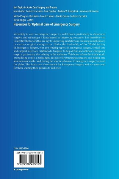 PART I KEY POSITION TOPICS Chapter 1 Resources and Designation of Emergency Surgery.- Chapter 2 Acute Care Surgery Unit Structure.- Chapter 3 Optimal Care in Geriatric Emergency Surgery (GES).- Chapter 4 Sepsis: Control and Treatment.- Chapter 5 Resuscitation in Emergency General Surgery.- Chapter 6 Medical Laboratory Support for Emergency Surgery.- Chapter 7 Radiology and Emergency Surgery.- Chapter 8 Interaction Between Gastroenterology and Emergency General Surgery.- Chapter 9 Advanced and Specialist Nursing Practice in Emergency Surgery - The Team Approach.- Chapter 10 Data, Registry, Quality Improvement and Patient Outcome Measures.- Chapter 11 Research in Emergency General Surgery.- Chapter 12 Education and Training in Emergency Surgery.- Chapter 13 Appendicitis.- Chapter 14 Acute Mesenteric Ischaemia.- Chapter 15 Intra-Abdominal Hypertension and Abdominal Compartment Syndrome - Updates.- PART II KEY PERFORMANCE INDICATORS Chapter 16 Cholecystitis.- Chapter 17 Pancreatitis.- Chapter 18 Upper GI Bleed.- Chapter 19 Small Bowel Obstruction.- Chapter 20 Perforated Gastroduodenal Ulcer (PGDU).- Chapter 21 Acute Diverticulitis (AD) - Management Phase.- Chapter 22 Abdominal Vascular Emergencies.- Chapter 23 Coagulation.- Chapter 24 Wound Care.- Chapter 25 Complications in Emergency General Surgery.