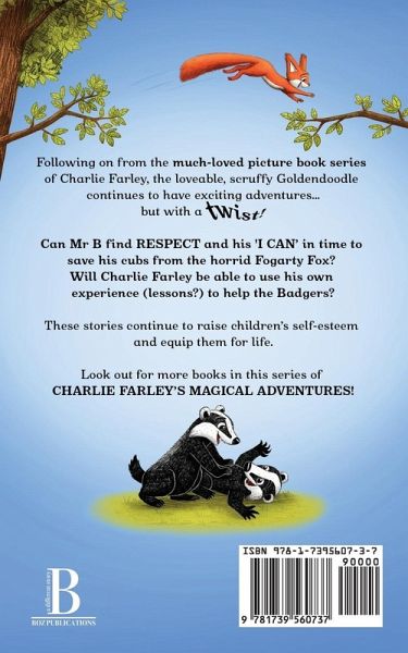 Following on from the much-loved picture book series of Charlie Farley, the loveable, scruffy Goldendoodle continues to have exciting adventures... but with a TWIST! Can Mr B find RESPECT and his 'I CAN' in time to save his cubs from the horrid Fogarty Fox? Will Charlie Farley be able to use his own experience (lessons?) to help the Badgers? These stories continue to raise children's self-esteem and equip them for life. Look out for more books in this series of CHARLIE FARLEY'S MAGICAL ADVENTURES!