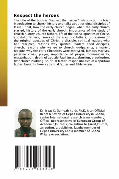 The title of the book is "Respect the heroes", introduction is brief introduction to church history and talks about original disciples of Jesus Christ, how the early church began, when the early church started, history of the early church, importance of the study of church history, church fathers, life of the twelve apostles of Christ, apostolic fathers, names of the apostolic fathers, professions of the original apostles of Christ, a disciple, spiritual leaders who had disciples, reasons why spiritual leaders need disciples, church, reasons why we go to church, godparents, a martyr, reasons why the early Christians were martyred, famous martyrs, peterine cross, prayer, importance of prayer, homosexuality, masturbation, death of apostle Paul, incest, abortion, prostitution, first church building, spiritual father, responsibilities of a spiritual father, benefits from a spiritual father and Bible verses.