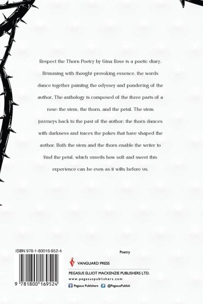 Respect the Thorn Poetry by Gina Rose is a poetic diary. Brimming with thought-provoking essence, the words dance together painting the odyssey and pondering of the author. The anthology is composed of the three parts of a rose: the stem, the thorn, and the petal. The stem journeys back to the past of the author; the thorn dances with darkness and traces the pokes that have shaped the author. Both the stem and the thorn enable the writer to find the petal, which unveils how soft and sweet this experience can be even as it wilts before us.