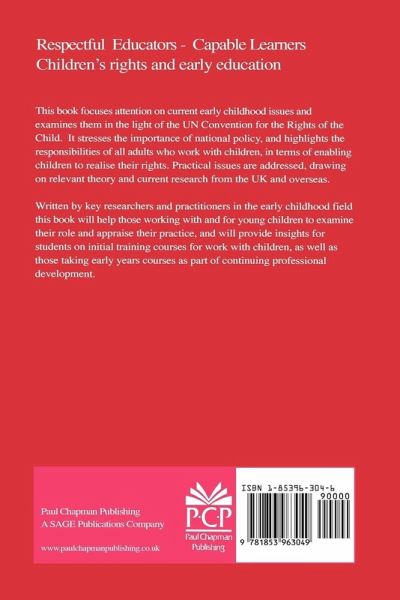 The United Nations Convention on the Rights of the Child - Gerison Lansdown Progress in the United Kingdom Inspection of Early Years in Schools - Jean Ensing Language, Culture and Difference - Iram Siraj-Blatchford Challenging Inequality and Promoting Respect Choices in Learning - Wendy Scott Wide Eyes and Open Minds - Cathy Nutbrown Observing, Assessing and Respecting Children's Early Achievements Children with Special Educational Needs - Elaine Herbert and Jenny Moir A Collaborative and Inclusive Style of Working Do We Train Our Early Childhood Educators to Respect Children? - Audrey Curtis Parents and Early Childhood Educators - Kath Hirst Working Together for Children's Rights Their Right to Play - Tricia David Questions for Respectful Educators - Cathy Nutbrown