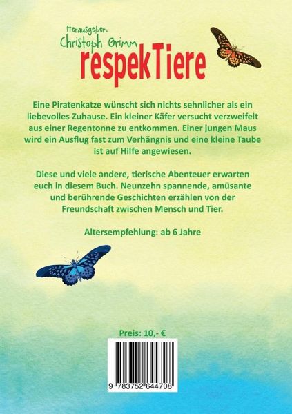 Eine Piratenkatze wünscht sich nichts sehnlicher als ein liebevolles Zuhause. Ein kleiner Käfer versucht verzweifelt aus einer Regentonne zu entkommen. Einer jungen Maus wird ein Ausflug fast zum Verhängnis und eine kleine Taube ist auf Hilfe angewiesen. Diese und viele andere, tierische Abenteuer erwarten euch in diesem Buch. Neunzehn spannende, amüsante und berührende Geschichten erzählen von der Freundschaft zwischen Mensch und Tier. Ab 6 Jahren