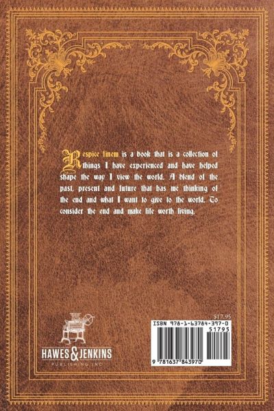 Respice finem is a book that is a collection of things I have experienced and have helped shape the way I view the world. A blend of the past, present and future that has me thinking of the end and what I want to give to the world. To consider the end and make life worth living.