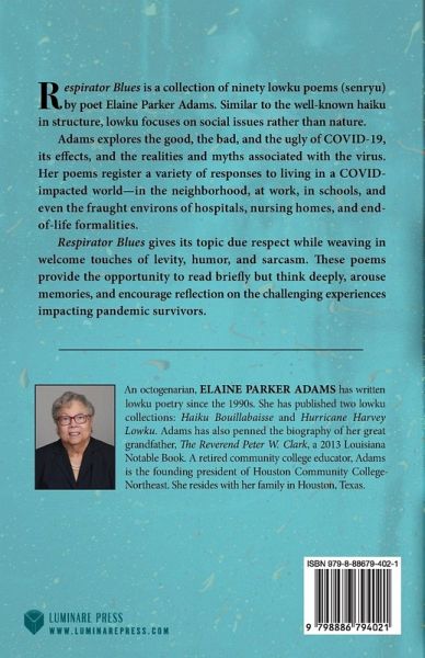 Respirator Blues is a collection of ninety lowku poems (senryu) by poet Elaine Parker Adams. Similar to the well-known haiku in structure, lowku focuses on social issues rather than nature. Adams explores the good, the bad, and the ugly of COVID-19, its effects, and the realities and myths associated with the virus. Her poems register a variety of responses to living in a COVID-impacted world-in the neighborhood, at work, in schools, and even the fraught environs of hospitals, nursing homes, and end-of-life formalities. Respirator Blues gives its topic due respect while weaving in welcome touches of levity, humor, and sarcasm. These poems provide the opportunity to read briefly but think deeply, arouse memories, and encourage reflection on the challenging experiences impacting pandemic survivors.