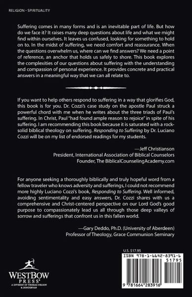 Suffering comes in many forms and is an inevitable part of life. But how do we face it? It raises many deep questions about life and what we might find within ourselves. It leaves us confused, looking for something to hold on to. In the midst of suffering, we need comfort and reassurance. When the questions overwhelm us, where can we find answers? We need a point of reference, an anchor that holds us safely to shore. This book explores the complexities of our questions about suffering with the understanding and compassion of personal experience. It provides concrete and practical answers in a meaningful way that we can all relate to. If you want to help others respond to suffering in a way that glorifies God, this book is for you. Dr. Cozzi's case study on the apostle Paul struck a powerful chord with me when he writes about the three triads of Paul's suffering. In Christ, Paul "had found ample reason to rejoice" in spite of his suffering. I am recommending this book because it is saturated with a rock-solid biblical theology on suffering. Responding to Suffering by Dr. Luciano Cozzi will be on my list of endorsed readings for my students. -Jeff Christianson President, International Association of Biblical Counselors Founder, The BiblicalCounselingAcademy.com For anyone seeking a thoroughly biblically and truly hopeful word from a fellow traveler who knows adversity and sufferings, I could not recommend more highly Luciano Cozzi's book, Responding to Suffering. Well informed, avoiding sentimentality and easy answers, Dr. Cozzi shares with us a comprehensive and Christ-centered perspective on our Lord God's good purpose to compassionately lead us all through those deep valleys of sorrow and sufferings that confront us in this fallen world. -Gary Deddo, Ph.D. (University of Aberdeen) Professor of Theology, Grace Communion Seminary