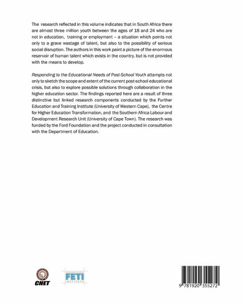 The research reflected in this volume indicates that in South Africa there are almost three million youth between the ages of 18 and 24 who are not in education, training or employment - a situation which points not only to a grave wastage of talent, but also to the possibility of serious social disruption. The authors in this work paint a picture of the enormous reservoir of human talent which exists in the country, but is not provided with the means to develop. Responding to the Educational Needs of Post-School Youth attempts not only to sketch the scope and extent of the current post-school educational crisis, but also to explore possible solutions through collaboration in the higher education sector. The findings reported here are a result of three distinctive but linked research components conducted by the Further Education and Training Institute (University of Western Cape), the Centre for Higher Education Transformation, and the Southern Africa Labour and Development Research Unit (University of Cape Town). The research was funded by the Ford Foundation and the project conducted in consultation with the Department of Education.