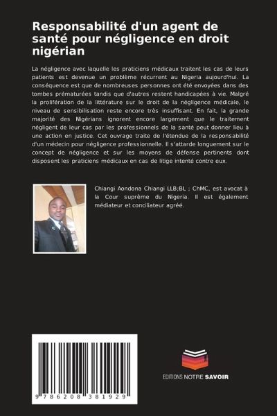 La négligence avec laquelle les praticiens médicaux traitent les cas de leurs patients est devenue un problème récurrent au Nigeria aujourd'hui. La conséquence est que de nombreuses personnes ont été envoyées dans des tombes prématurées tandis que d'autres restent handicapées à vie. Malgré la prolifération de la littérature sur le droit de la négligence médicale, le niveau de sensibilisation reste encore très insuffisant. En fait, la grande majorité des Nigérians ignorent encore largement que le traitement négligent de leur cas par les professionnels de la santé peut donner lieu à une action en justice. Cet ouvrage traite de l'étendue de la responsabilité d'un médecin pour négligence professionnelle. Il s'attarde longuement sur le concept de négligence et sur les moyens de défense pertinents dont disposent les praticiens médicaux en cas de litige intenté contre eux.