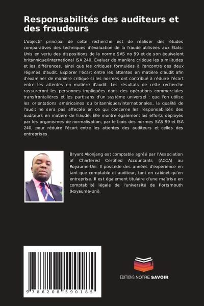 L'objectif principal de cette recherche est de réaliser des études comparatives des techniques d'évaluation de la fraude utilisées aux États-Unis en vertu des dispositions de la norme SAS no 99 et de son équivalent britannique/international ISA 240. Évaluer de manière critique les similitudes et les différences, ainsi que les critiques formulées à l'encontre des deux régimes d'audit. Explorer l'écart entre les attentes en matière d'audit afin d'examiner de manière critique si les normes ont contribué à réduire l'écart entre les attentes en matière d'audit. Les résultats de cette recherche rassureront les personnes impliquées dans des opérations commerciales transfrontalières et les partisans d'un système universel : que l'on utilise les orientations américaines ou britanniques/internationales, la qualité de l'audit ne sera pas affectée en ce qui concerne les responsabilités des auditeurs en matière de fraude. Elle montre également les efforts déployés par les organismes de normalisation, par le biais des normes SAS 99 et ISA 240, pour réduire l'écart entre les attentes des auditeurs et celles des entreprises.