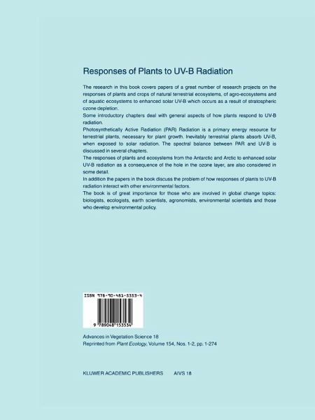 Photosynthetically Active Radiation (PAR) is a primary energy resource for terrestrial plants, necessary for plant growth. Inevitably terrestrial plants absorb UV-B when exposed to solar radiation. The spectral balance between PAR and UV-B is discussed in several chapters. The responses of plants and ecosystems from the Antarctic and Arctic to enhanced solar UV-B radiation as a consequence of the hole in the ozone layer are considered in some detail. In addition the papers in the book discuss the problem of how responses of plants to UV-B radiation interact with other environmental factors.