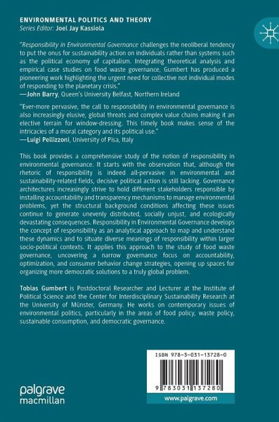 This book provides a comprehensive study of the notion of responsibility in environmental governance. It starts with the observation that, although the rhetoric of responsibility is indeed all-pervasive in environmental and sustainability-related fields, decisive political action is still lacking. Governance architectures increasingly strive to hold different stakeholders responsible by installing accountability and transparency mechanisms to manage environmental problems, yet the structural background conditions affecting these issues continue to generate unevenly distributed, socially unjust, and ecologically devastating consequences. Responsibility in Environmental Governance develops the concept of responsibility as an analytical approach to map and understand these dynamics and to situate diverse meanings of responsibility within larger socio-political contexts. It applies this approach to the study of food waste governance, uncovering a narrow governance focus on accountability, optimization, and consumer behavior change strategies, opening up spaces for organizing more democratic solutions to a truly global problem.