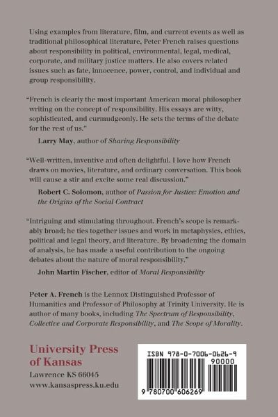 Most of us spend a fair amount of time trying to avoid responsibility. That's not too astounding. What is surprising, says Peter French, is that we tend to dodge the good variety as well as the bad. "The problem for most of us, excepting moral masochists, is that responsibility does get doled," he writes. "The strategy is either not to be in the receiving line or to find a way to get as little dumped on one's plate as possible, to trade off to others as much as one can. Consequently, the responsibility barter game is probably the most common experience ordinary people have with morality." In Responsibility Matters, French investigates a variety of matters relating to responsibility-from theoretical aspects and elements of the concept of responsibility to specific areas of application and general issues in moral theory. Unlike Kant and others who see responsibility as a necessary presupposition of practical life, he believes it is a set of practices that we use to describe and understand individual and social behavior. Using examples from literature, film, and current events as well as traditional philosophical literature, he raises questions about responsibility in political, environmental, legal, medical, corporate, and military justice matters. He also covers other issues, including fate, innocence, power, control, and individual and group responsibility.