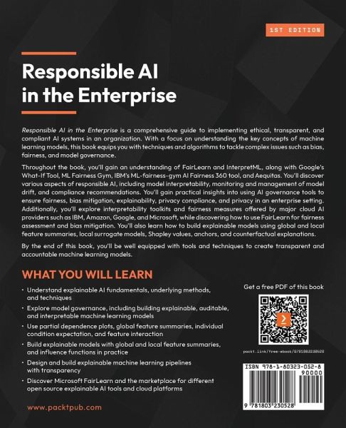 Build and deploy your AI models successfully by exploring model governance, fairness, bias, and potential pitfalls Purchase of the print or Kindle book includes a free PDF eBookKey FeaturesLearn ethical AI principles, frameworks, and governance Understand the concepts of fairness assessment and bias mitigation Introduce explainable AI and transparency in your machine learning models Book Description Responsible AI in the Enterprise is a comprehensive guide to implementing ethical, transparent, and compliant AI systems in an organization. With a focus on understanding key concepts of machine learning models, this book equips you with techniques and algorithms to tackle complex issues such as bias, fairness, and model governance. Throughout the book, you'll gain an understanding of FairLearn and InterpretML, along with Google What-If Tool, ML Fairness Gym, IBM AI 360 Fairness tool, and Aequitas. You'll uncover various aspects of responsible AI, including model interpretability, monitoring and management of model drift, and compliance recommendations. You'll gain practical insights into using AI governance tools to ensure fairness, bias mitigation, explainability, privacy compliance, and privacy in an enterprise setting. Additionally, you'll explore interpretability toolkits and fairness measures offered by major cloud AI providers like IBM, Amazon, Google, and Microsoft, while discovering how to use FairLearn for fairness assessment and bias mitigation. You'll also learn to build explainable models using global and local feature summary, local surrogate model, Shapley values, anchors, and counterfactual explanations. By the end of this book, you'll be well-equipped with tools and techniques to create transparent and accountable machine learning models.What you will learnUnderstand explainable AI fundamentals, underlying methods, and techniques Explore model governance, including building explainable, auditable, and interpretable machine learning models Use partial dependence plot, global feature summary, individual condition expectation, and feature interaction Build explainable models with global and local feature summary, and influence functions in practice Design and build explainable machine learning pipelines with transparency Discover Microsoft FairLearn and marketplace for different open-source explainable AI tools and cloud platforms Who this book is for This book is for data scientists, machine learning engineers, AI practitioners, IT professionals, business stakeholders, and AI ethicists who are responsible for implementing AI models in their organizations.Table of ContentsA Primer on Explainable and Ethical AI Algorithms Gone Wild - Bias's Greatest Hits Opening the Algorithmic Blackbox Operationalizing Model Monitoring Model Governance - Audit, and Compliance Standards & Recommendations Enterprise Starter Kit for Fairness, Accountability and Transparency Interpretability Toolkits and Fairness Measures Fairness in AI System with Microsoft FairLearn Fairness Assessment and Bias Mitigation with FairLearn and Responsible AI Toolbox Foundational Models and Azure OpenAI