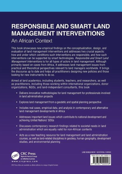 This book showcases new empirical findings on the conceptualization, design, and evaluation of land management interventions and addresses two crucial aspects: how and under which conditions such interventions are responsible, and how such interventions can be supported by smart technologies. Responsible and Smart Land Management Interventions is for all types of actors in land management. Although primarily based on cases from Africa, it addresses land management issues from practical and theoretical perspectives relevant for land managers worldwide. It brings the discourse up to date and helps all practitioners designing new policies and those looking for new instruments to do so.