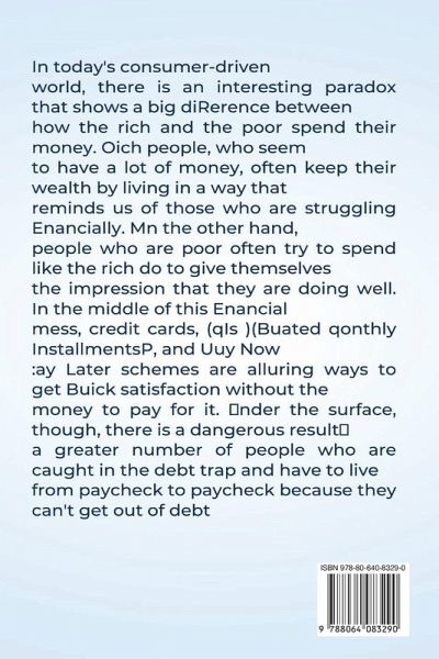 In today's consumer-driven world, there is an interesting paradox that shows a big di.erence between how the rich and the poor spend their moneyR fich people, who seem to have a lot ok money, okten Oeep their wealth by living in a way that reminds us ok those who are struggling EnanciallyR Mn the other hand, people who are poor okten try to spend liOe the rich do to give themselves the impression that they are doing wellR In the middle ok this Enancial mess, credit cards, (qIs )(Buated qonthly InstallmentsN, and Puy Low Uay :ater schemes are alluring ways to get BuicO satiskaction without the money to pay kor itR Cnder the surkace, though, there is a dangerous resultT a greater number ok people who are caught in the debt trap and have to live krom paychecO to paychecO because they can't get out ok debtR In a society that is kull ok shopping and a constant need kor new things, easy credit has made it possible kor people to tell themselves that they can live liOe the rich without getting richer or maOing more moneyR jredit cards are easy to get and let you buy things without using cash right awayR 2his maOes people more liOely to go on shopping sprees on the spur ok the moment and buy things Wust because they want to show o. or get noticedR