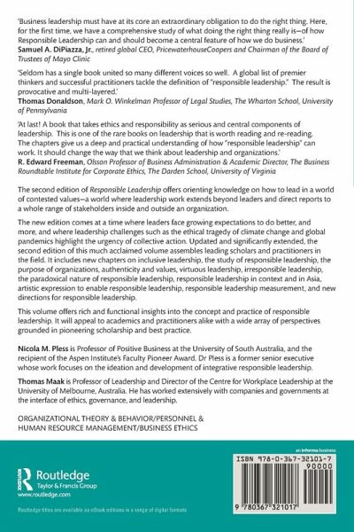 The new edition comes at a time where leaders face growing expectations to do better, and more, and where leadership challenges such as the ethical tragedy of climate change and global pandemics highlight the urgency of collective action. Updated and significantly extended, the second edition of this much acclaimed volume assembles leading scholars and practitioners in the field. It includes new chapters on inclusive leadership, the study of responsible leadership, the purpose of organizations, authenticity and values, virtuous leadership, irresponsible leadership, the paradoxical nature of responsible leadership, responsible leadership in context and in Asia, artistic expression to enable responsible leadership, responsible leadership measurement, and new directions for responsible leadership.