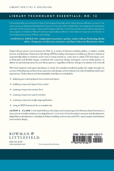 Today's library patrons are browsing the Web on a variety of devices including tablets, e-readers, mobile phones, and desktops. Responsive web design employs techniques that will enable your library's website to automatically adapt to whatever screen size it's being viewed on. Learn how to utilize CSS techniques such as fluid grids and flexible images combined with responsive design techniques such as media queries to deliver an optimal experience for your library patrons regardless of device. Design one website to fit them all. With both beginner and expert developers in mind, this complete handbook guides the reader through the process of developing and launching their own Responsive Web Designs and introduces the craft of building multi-screen experiences. Online demos and downloadable code files are included for all projects: ·Adapting your Existing Layout into a Responsive Layout - A RWD Retrofit ·Building a Responsive Layout from Scratch - A RWD Bookreader ·Creating a Responsive Contact Form - "Get a Library Card" ·Creating a Responsive Search Interface ·Creating a Responsive Single Page Application - "Mobile Feed App" ·Using an RWD Framework for a complete site: Twitter Bootstrap