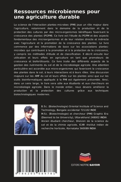 La science de l'interaction plantes-microbes (PMI) joue un rôle majeur dans l'agriculture, notamment dans le domaine de la production et de la protection des cultures par des micro-organismes bénéfiques favorisant la croissance des plantes (PGPM). Ce livre est l'étude du PGPM et des aspects fondamentaux des microorganismes et de leur relation directe et indirecte avec l'agriculture et la promotion de la croissance des plantes. Le livre commence par des informations de base sur les associations plantes-microbes qui contribuent à la promotion et à la protection de la croissance, y compris les méthodes d'étude et de classification. Il décrit ensuite leur utilisation et leurs effets en agriculture en tant que promoteurs de croissance et biofertilisants. Ce livre traite des différents aspects de la gestion des nutriments du sol et de la microbiologie agricole. Une attention particulière est accordée aux micro-organismes qui favorisent la croissance des plantes dans le sol, à leurs interactions et à leurs rôles. Une discussion majeure sur les AMF du sol et leurs effets sur les plantes ainsi que sur les outils bioinformatiques appliqués à la PMI est également présentée. Ainsi, dans un sens large, le livre sera utile aux étudiants et aux chercheurs en microbiologie agricole. Dans le monde entier, nous devons améliorer la production et la protection des cultures grâce aux techniques biotechnologiques modernes.