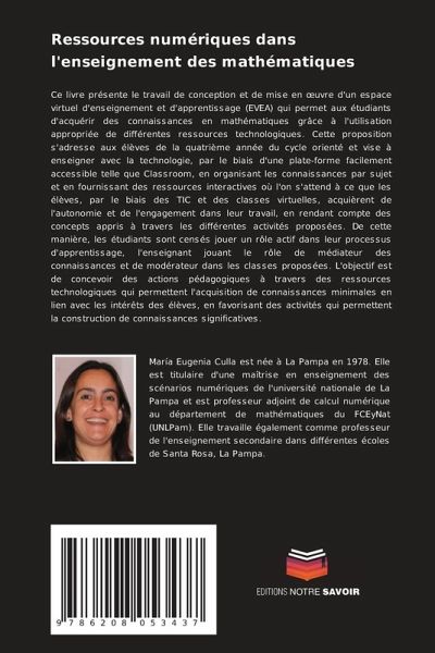 Ce livre présente le travail de conception et de mise en oeuvre d'un espace virtuel d'enseignement et d'apprentissage (EVEA) qui permet aux étudiants d'acquérir des connaissances en mathématiques grâce à l'utilisation appropriée de différentes ressources technologiques. Cette proposition s'adresse aux élèves de la quatrième année du cycle orienté et vise à enseigner avec la technologie, par le biais d'une plate-forme facilement accessible telle que Classroom, en organisant les connaissances par sujet et en fournissant des ressources interactives où l'on s'attend à ce que les élèves, par le biais des TIC et des classes virtuelles, acquièrent de l'autonomie et de l'engagement dans leur travail, en rendant compte des concepts appris à travers les différentes activités proposées. De cette manière, les étudiants sont censés jouer un rôle actif dans leur processus d'apprentissage, l'enseignant jouant le rôle de médiateur des connaissances et de modérateur dans les classes proposées. L'objectif est de concevoir des actions pédagogiques à travers des ressources technologiques qui permettent l'acquisition de connaissances minimales en lien avec les intérêts des élèves, en favorisant des activités qui permettent la construction de connaissances significatives.