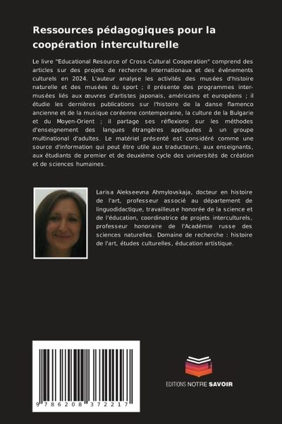 Le livre "Educational Resource of Cross-Cultural Cooperation" comprend des articles sur des projets de recherche internationaux et des événements culturels en 2024. L'auteur analyse les activités des musées d'histoire naturelle et des musées du sport ; il présente des programmes inter-musées liés aux oeuvres d'artistes japonais, américains et européens ; il étudie les dernières publications sur l'histoire de la danse flamenco ancienne et de la musique coréenne contemporaine, la culture de la Bulgarie et du Moyen-Orient ; il partage ses réflexions sur les méthodes d'enseignement des langues étrangères appliquées à un groupe multinational d'adultes. Le matériel présenté est considéré comme une source d'information qui peut être utile aux traducteurs, aux enseignants, aux étudiants de premier et de deuxième cycle des universités de création et de sciences humaines.