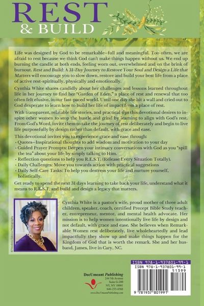 Life was designed by God to be remarkable – full and meaningful. Too often, we are afraid to rest because we think God can’t make things happen without us. We end up burning the candle at both ends, feeling worn out, overwhelmed and on the brink of burnout. "Rest and Build: A 31-Day Journey to Restore Your Soul and Design a Life that Matters" will encourage you to slow down, restore and build your best life from a place of active rest—spiritually, physically and emotionally. Cynthia White shares candidly about her challenges and lessons learned throughout life in her journey to find her "garden of Eden," a place of rest and renewal that too often felt elusive, in our fast-paced world. Until one day she hit a wall and cried out to God desperate to learn how to build her life of impact from a place of rest. With transparent, relatable life stories, and practical tips this devotional desires to inspire other women to stop the hustle and grind by learning to align with God’s rest. From God’s Word, invite them to take the journey of rest deliberately and begin to live life purposefully by design rather than default, with grace and ease. This devotional will invite you to experience grace and ease through: Quotes-Inspirational thoughts to add wisdom and motivation to your day Guided Prayer Prompts: Deepen your intimacy conversations with God as you "spill the tea" about your life by simply talking to Him. Reflection questions to help you R.E.S.T. (Release Every Situation Totally). Daily Challenges: Move you towards action with practical suggestions Daily Self-Care Tasks: To help you destress your life and nurture yourself, holistically. Get ready to spend the next 31 days learning to take back your life, understand what it means to REST, and build and design a legacy that matters.