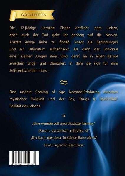 Die 17-jährige Lorraine Fisher ist tot. Dennoch geht ihre Geschichte weiter. Dabei wollte sie doch nur ihre Ruhe haben. Was wollen nur alle von ihr? Plötzlich kriegt sie Bedingungen und ein Ultimatum aufgedrückt, Engel und Dämonen sind gleichermaßen hinter ihr her und laufend spürt sie diesen eigenartigen Sog in die Dunkelheit. Der Nach-Tod geht ihr schnell gehörig auf die Nerven. Sie beschließt zu fliehen und fordert damit unweigerlich das Schicksal heraus. Vorsicht, dieses Buch hat es in sich!Eine rasante Teenage-Nach-Tod-Erfahrung zwischen mystischer Ewigkeit und der Sex-Drugs-Rock'n'Roll-Realität des Lebens. Eine fesselnde Dark-Fantasy Kreation, die Ihr lieben werdet!Diese Geschichte ist so direkt, heftig und ungeschönt wie das Leben nun mal ist. Lorraine nimmt kein Blatt vor den Mund und lässt sich von niemanden etwas sagen. Sie kämpft ihren eigenen Kampf, aber das Schicksal hat offensichtlich andere Pläne mit ihr. Ein Buch über das, was in einem steckt: der Ärger, die Ängste, die Unsicherheit genauso wie Mut und Stärke. Wir erschaffen im Leben unsere eigene Realität und das zeigt Lorraine auf schonungslose Art und mit direkter Sprache. Schließlich ist auch das Leben voller Turbulenzen. Und natürlich geht es um die Sehnsucht nach Dunkelheit, seelenwärmende Melancholie, Verbotenes, Tabus, psychodelischen Teenage-Sex, genauso wie zornig, vierliebt, verwirrt und ahnungslos zu sein, bis man auf sein Innerstes hört und seinen Weg findet.Viel Spaß beim Lesen!Benedict ErnstFollow me on Instagram: @der_benedict_ernst
