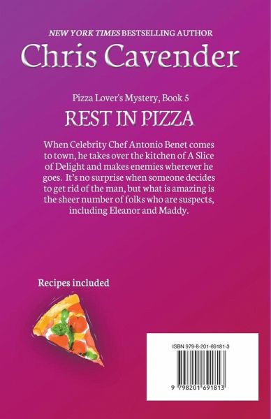 REST IN PIZZA by Chris Cavender (Pizza Lover's Mystery Book 5) From the Pizza Lover's Mysteries, first published by Kensington. Praise for The Pizza Lover's Mysteries "Just like a pizza with all your favorite toppings, this series will satisfy even the most finicky cozy readers." RT Book Reviews "Scrumptious…this entertaining series will continue to gain fans with its clever plotting and small town appeal." RT Book Reviews "Pizza lovers will relish Cavender's delightful first in a new cozy series." Publisher's Weekly "Cavender introduces a promising cast of characters." Booklist "A delightful mystery—as filling as a big slice of warm pizza." Armchair Detective "Saucy debut…with all the ingredients needed for an enjoyable treat" Lesa's Book Critiques "Cavender is an ace at writing cozies." Library Journal When Celebrity Chef Antonio Benet comes to town for a book-signing, he takes over the kitchen of A Slice of Delight and makes enemies wherever he goes. It's no surprise when someone decides to end the chef's bestselling run, but what is amazing is the sheer number of folks who wanted to see the end of the obnoxious chef, including Eleanor and Maddy. Two dessert pizza recipes included!