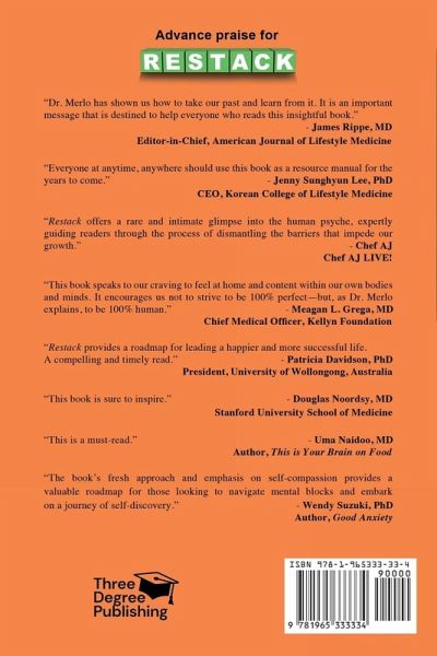 Do you have Mental Blocks keeping you from your goals? Have you tried multiple times to eat healthier, exercise more, decrease your stress, and get restful sleep, but the behavioral changes didn't stick? Restack is a book that embraces our humanness, with our quirks and imperfections, and provides tools and practical suggestions to Restack ourselves in a way that's psychologically freeing. To Restack is the process of identifying our Mental Blocks and then categorizing and tweaking parts of ourselves we want to keep, as well as what is no longer serving us. The aim is not to create an idealized version of a perfect human, but to Restack the metaphorical tower of our blocks to end up with a new and reinvigorated Restack of ourselves. Restack explores lifestyle interventions, backed by science, to propel us forward on our journey of both mental and physical health. The concepts presented are a part of the big puzzle of brain health-each piece of the puzzle affects our overall physical and emotional health, and how we can manage this impact through lifestyle interventions. The book contains multiple tables and figures, as well as "self-help prescriptions," all serving as tools to provide guidance and help you achieve your goals. Additionally, Gia Merlo, as a practicing psychiatrist, shares her journey through her imperfections, mistakes, and Mental Blocks to come to a place of self-acceptance and healing. The ultimate goal of this book is not to be 100% healthy or 100% perfect, but to feel 100% human - actualizing our full human potential.