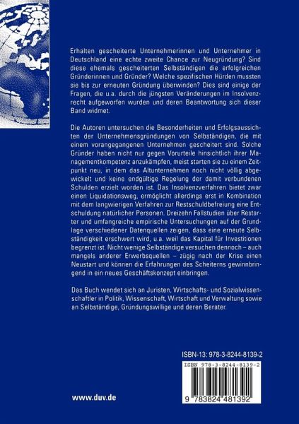 An Hand von dreizehn Fallstudien über Restarter und umfangreichen empirische Untersuchungen zeigen die Autoren die Besonderheiten und Erfolgsaussichten der Unternehmensgründungen von Selbständigen, die mit einem vorangegangenen Unternehmen gescheitert sind.