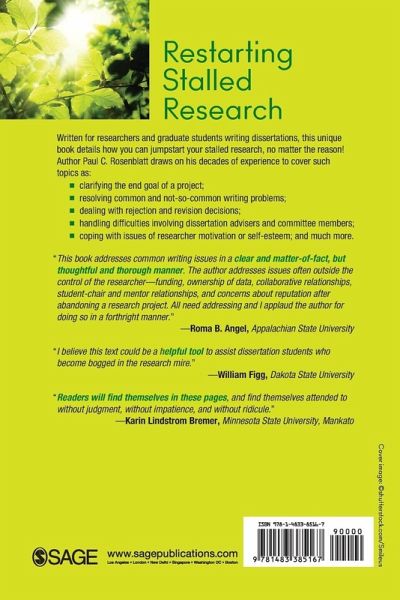 The focus of this book is a problem that unfortunately can be fairly common, and that problem is one of stalled research and dissertations. It provides practical solutions, perspective, hope, and ideas for restarting that will help with many of the issues that are involved in stalled research. It is not a simple formula to follow, rather, it is suggestions and ideas for those struggling with stalled projects to get them on the road to finishing those projects.Written for researchers and graduate students writing dissertations, Restarting Stalled Research is a unique book that offers detailed advice and perspective on many issues that can stall a research project and reveals what can be done to successfully resume it. Using a direct yet conversational style, author Paul C. Rosenblatt draws on his decades of experience to cover many diverse topics. The text guides readers through challenges such as clarifying the end goal of a project; resolving common and not-so-common writing problems; dealing with rejection and revision decisions; handling difficulties involving dissertation advisers and committee members; coping with issues of researcher motivation or self-esteem; and much more.