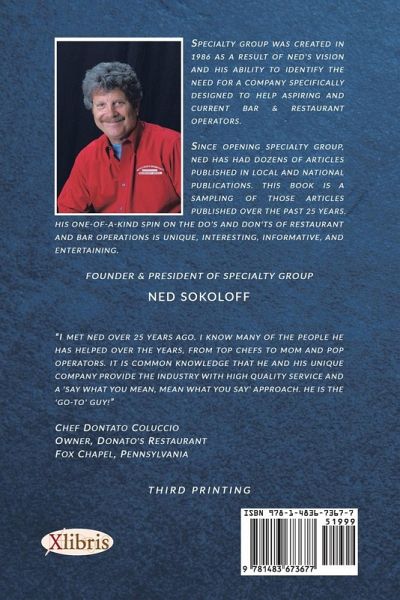 Specialty Group was created in 1986 as a result of Neds vision and his ability to identify the need for a company specifically designed to help aspiring and current bar and restaurant operators. Since opening Specialty Group, Ned has had dozens of articles published in local and national publications. This book is a sampling of those articles published over the past 25 years. His one-of-a-kind spin on the dos and donts of restaurant and bar operations is unique, interesting, informative and entertaining.