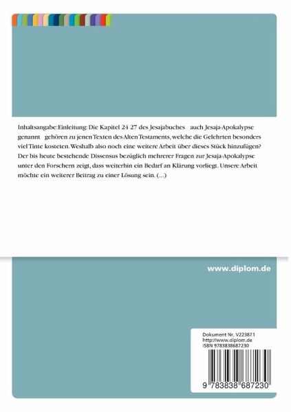 Inhaltsangabe:Einleitung: Die Kapitel 24?27 des Jesajabuches ? auch Jesaja-Apokalypse genannt ? gehören zu jenen Texten des Alten Testaments, welche die Gelehrten besonders viel Tinte kosteten. Weshalb also noch eine weitere Arbeit über dieses Stück hinzufügen? Der bis heute bestehende Dissensus bezüglich mehrerer Fragen zur Jesaja-Apokalypse unter den Forschern zeigt, dass weiterhin ein Bedarf an Klärung vorliegt. Unsere Arbeit möchte ein weiterer Beitrag zu einer Lösung sein. Den Anlass für diese Arbeit gab eine nähere Beschäftigung mit der Frage der Auferstehung im Alten Testament und die damit verbundene Feststellung, dass die Interpretation von Jes. 26:19 in diesem Zusammenhang besonders umstritten ist. Während ein Grossteil der Gelehrten der Meinung ist, mit der Wiederbelebung in Jes. 26:19 sei leibliche Auferstehung gemeint ? ja es handle sich hier um den ersten klaren Hinweis auf eine leibliche Auferstehung im Alten Testament überhaupt ? deuten zahlreiche andere Wissenschaftler die Stelle metaphorisch auf die nationale Wiederherstellung Israels und einige wenige auf die geistige Wiedergeburt. Welche dieser drei Deutungen ist richtig? Kann man die Frage überhaupt mit (letzter) Gewissheit beantworten? Soviel ist klar: losgelöst vom Kontext, nur für sich genommen, kann der Vers à la limite tatsächlich jede der genannten Bedeutungen haben. Wenn überhaupt, dann ist eine Entscheidung zwischen den verschiedenen Vorschlägen nur im Lichte des Kontexts möglich. Damit verbunden ist (bzw. wird) aber nicht zuletzt auch die Frage der Genesis der Jesaja-Apokalypse: Bilden die vier Kapitel eine ursprüngliche Einheit oder sind sie das Resultat eines (mitunter langen) Wachstumsprozesses? Ist die so genannte Jesaja-Apokalypse ein buntes Patchwork, bestehend aus mehreren ursprünglich unabhängigen Perikopen, die bei der Zusammensetzung durch einen so genannten Redaktor oder Kompilator, je nachdem, vielleicht mitunter noch ? zum Zweck der Anpassung an den neuen Kontext ? umgeschrieben oder ergänzt wurden und wenn ja, ist zudem vielleicht noch an weitere noch spätere Glossen ? wenn vielleicht auch nur von wenigen einzelnen Versen oder Versteilen ? zu denken, oder bildete die ganze Apokalypse von Anfang an eine wesentliche Einheit, in welche aber später vielleicht doch noch die eine oder andere Passage (z. B. 24:21-23 oder 25:10b-12) oder vereinzelte Verse (z. B. 26:19) oder vielleicht auch nur das eine oder andere Sätzchen (z. B. 25:8a) oder mitunter sogar nur [¿]