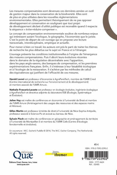 Les mesures compensatoires sont devenues ces dernières années un outil de gestion majeur dans la conservation de la biodiversité. Elles sont de plus en plus utilisées dans les nouvelles réglementations environnementales. Elles permettent théoriquement de ne pas opposer développement et conservation en soulignant que tout projet de développement déclaré d'utilité publique est recevable quand il respecte la séquence éviter-réduire-compenser.Le concept de compensation environnementale soulève de nombreux enjeux qui intéressent autant l'écologue, le géographe, l'économiste que le juriste. C'est le point de départ de cet ouvrage qui en propose une lecture transversale, interdisciplinaire, empirique et actuelle.Pour mener à bien ce travail, les auteurs ont pris le parti de traiter les thèmes de recherche les plus débattus sur le sujet en France et à l'étranger. L'ouvrage présente les conditions institutionnelles à l'origine de l'émergence des mesures compensatoires. Puis il décrit leurs évolutions récentes dans le domaine de la régulation décentralisée avec l'apparition, dans les pays anglo-saxons, des banques de compensation, et les premières expérimentations françaises. Enfin, il s'intéresse à leur faisabilité écologique et à l'écologie de la restauration. Il s'achève par les méthodes de calcul des équivalences qui justifient de l'efficacité de ces mesures.