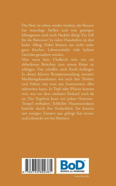 Das Brot ist schon wieder trocken, die Banane hat matschige Stellen und vom gestrigen Mittagessen sind noch Nudeln übrig? Ein Fall für die Biotonne? In vielen Haushalten ist dies leider Alltag. Dabei können aus nicht mehr ganz frischen Lebensmitteln viele leckere Gerichte gezaubert werden. Man muss kein Chefkoch sein, um ein altbackenes Brötchen zum armen Ritter zu schlagen. Das schaffen auch Koch-Anfänger. In dieser kleinen Rezeptesammlung verraten Nachkriegshausfrauen wie auch ihre Töchter und Söhne, was man aus Essensresten alles zubereiten kann. In Topf oder Pfanne kommt rein, was vor dem nächsten Einkauf noch da ist. Das Ergebnis kann mit jedem Gourmet-Tempel mithalten. Schlichte Hausmannskost besticht durch ihre Einfachheit. Sie kommt mit wenigen Zutaten aus, gelingt fast immer und schmeckt wie bei Muttern.