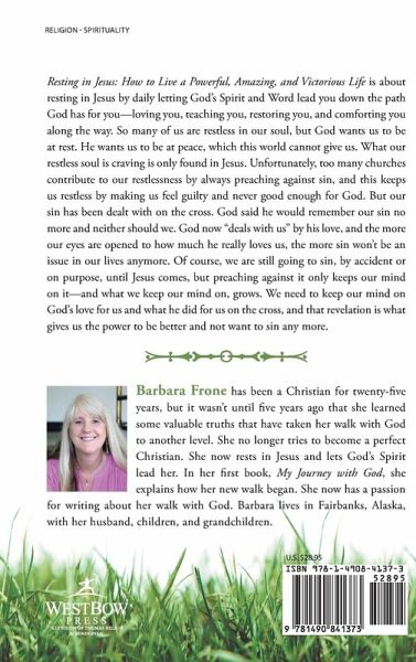 Resting in Jesus: How to Live a Powerful, Amazing, and Victorious Life is about resting in Jesus by daily letting God's Spirit and Word lead you down the path God has for you-loving you, teaching you, restoring you, and comforting you along the way. So many of us are restless in our soul, but God wants us to be at rest. He wants us to be at peace, which this world cannot give us. What our restless soul is craving is only found in Jesus. Unfortunately, too many churches contribute to our restlessness by always preaching against sin, and this keeps us restless by making us feel guilty and never good enough for God. But our sin has been dealt with on the cross. God said he would remember our sin no more and neither should we. God now "deals with us" by his love, and the more our eyes are opened to how much he really loves us, the more sin won't be an issue in our lives anymore. Of course, we are still going to sin, by accident or on purpose, until Jesus comes, but preaching against it only keeps our mind on it-and what we keep our mind on, grows. We need to keep our mind on God's love for us and what he did for us on the cross, and that revelation is what gives us the power to be better and not want to sin any more.