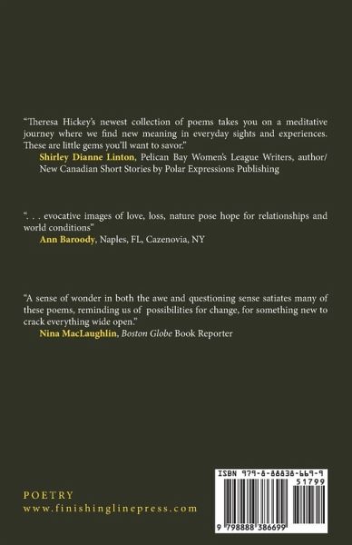 "Theresa Hickey's newest collection of poems takes you on a meditative journey where we find new meaning in everyday sights and experiences. These are little gems you'll want to savor." Shirley Dianne Linton, Pelican Bay Women's League Writers, author/New Canadian Short Stories by Polar Expressions Publishing ". . . evocative images of love, loss, nature pose hope for relationships and world conditions" Ann Baroody, Naples, FL, Cazenovia, NY "A sense of wonder in both the awe and questioning sense satiates many of these poems, reminding us of possibilities for change, for something new to crack everything wide open." Nina MacLaughlin, Boston Globe Book Reporter