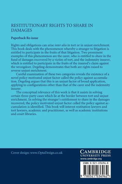 Rights and obligations can arise, amongst other things, in tort or in unjust enrichment. Simone Degeling deals with the phenomenon whereby a stranger to litigation is entitled to participate in the fruits of that litigation. Two prominent examples of this phenomenon are the carer, entitled to share in the fund of damages recovered by a victim of tort, and the indemnity insurer, entitled to participate in the fruits of the insured's claim against the wrongdoer. Degeling demonstrates that both are rights raised to reverse unjust enrichment. Careful examination of these two categories reveals the existence of a novel policy-motivated unjust factor called the policy against accumulation. Degeling argues that this is an unjust factor of broad application, applying to configurations other than that of the carer and the indemnity insurer. This will interest restitution and tort lawyers, both academic and practitioner, as well as academic institutions and court libraries.
