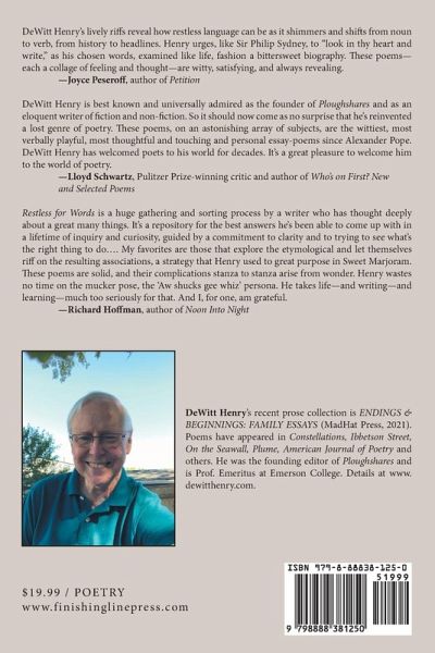 Former Shakespeare teacher, novelist, memoirist, and founding editor of Ploughshares, DeWitt Henry in his first full collection of poems goes in varied and unexpected directions, from "mapping the heart" to meditating on the DNA of everyday words such as "candidate." He delights in quick-witted, gymnastic free association, contrary directions of thought and argument, and freely negotiates between the colloquial and literary, the personal and the cultural, and mixes moral searching with a benign, self-depreciating humor. His favorite pronoun is "we." A deeply lived, engaging, and original debut.