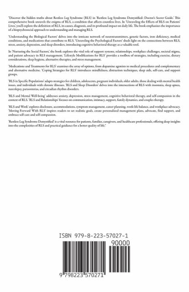 "Discover the hidden truths about Restless Leg Syndrome (RLS) in 'Restless Leg Syndrome Demystified: Doctor's Secret Guide.' This comprehensive book unravels the enigma of RLS, a condition that affects countless lives. In 'Unraveling the Effects of RLS on Patients' Lives,' you'll explore the definition of RLS, its causes, diagnosis, and its profound impact on daily life. The book emphasizes the importance of a biopsychosocial approach to understanding and managing RLS. 'Understanding the Biological Factors' delves into the intricate network of neurotransmitters, genetic factors, iron deficiency, medical conditions, and medications that contribute to RLS. 'Unraveling the Psychological Factors' sheds light on the connections between RLS, stress, anxiety, depression, and sleep disorders, introducing cognitive behavioral therapy as a valuable tool. In 'Nurturing the Social Factors,' the book explores the vital role of support systems, relationships, workplace challenges, societal stigma, and patient advocacy in RLS management. 'Lifestyle Modifications for RLS' provides a toolbox of strategies, including exercise, dietary considerations, sleep hygiene, alternative therapies, and stress management. 'Medications and Treatments for RLS' examines the array of options, from dopamine agonists to medical procedures and complementary and alternative medicine. 'Coping Strategies for RLS' introduces mindfulness, distraction techniques, sleep aids, self-care, and support groups. 'RLS in Specific Populations' adapts strategies for children, adolescents, pregnant individuals, older adults, those dealing with mental health issues, and individuals with chronic illnesses. 'RLS and Sleep Disorders' delves into the intersections of RLS with insomnia, sleep apnea, narcolepsy, parasomnias, and circadian rhythm disorders. 'RLS and Mental Well-being' addresses anxiety, depression, stress management, cognitive behavioral therapy, and self-compassion in the context of RLS. 'RLS and Relationships' focuses on communication, intimacy, support, family dynamics, and couples therapy. 'RLS and Work' explores disclosure, accommodations, symptom management, career planning, work-life balance, and workplace advocacy. 'Moving Forward With RLS' inspires readers to set realistic goals, create personalized management plans, advocate, find support, and embrace self-care and self-compassion. 'Restless Leg Syndrome Demystified' is a vital resource for patients, families, caregivers, and healthcare professionals, offering deep insights into the complexities of RLS and practical guidance for a better quality of life."