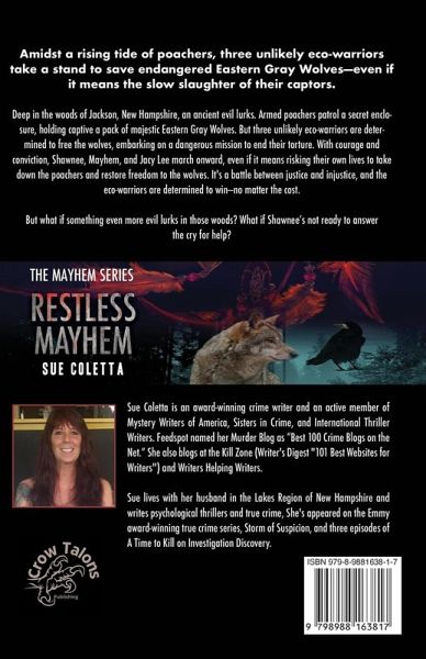Amidst a rising tide of poachers, three unlikely eco-warriors take a stand to save endangered Eastern Gray Wolves-even if it means the slow slaughter of their captors. Deep in the woods of Jackson, New Hampshire, an ancient evil lurks. Armed poachers patrol a secret enclosure, holding captive a pack of majestic Eastern Gray Wolves. But three unlikely eco-warriors are determined to free the wolves, embarking on a dangerous mission to end their torture. With courage and conviction, Shawnee, Mayhem, and Jacy Lee march onward, even if it means risking their own lives to take down the poachers and restore freedom to the wolves. It's a battle between justice and injustice, and the eco-warriors are determined to win-no matter the cost. But what if something even more evil lurks in those woods? What if Shawnee's not ready to answer the cry for help?