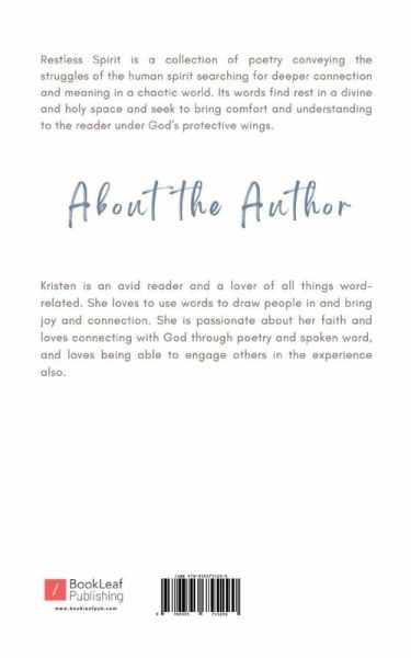 Restless Spirit is a collection of poetry conveying the struggles of the human spirit searching for deeper connection and meaning in a chaotic world. Its words find rest in a divine and holy space and seek to bring comfort and understanding to the reader under God's protective wings.
