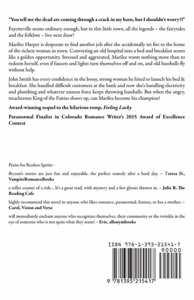"You tell me the dead are coming through a crack in my barn, but I shouldn't worry?!" Fayetteville seems ordinary enough, but in this little town, all the legends - the fairytales and the folklore - live next door! Marilee Harper is desperate to find another job after she accidentally set fire to the home of the richest woman in town. Converting an old hospital into a bed and breakfast seems like a golden opportunity. Stressed and aggravated, Marilee wants nothing more than to redeem herself, even if faucets and lights turn themselves off and on, and old baseballs fly without help. John Smith has every confidence in the bossy, strong woman he hired to launch his bed & breakfast. She handled difficult customers at the bank and now she's handling electricity and plumbing and whatever unseen force keeps throwing baseballs. But when the angry, treacherous King of the Fairies shows up, can Marilee become his champion? Award-winning sequel to the hilarious romp, Feeling Lucky Paranormal Finalist in Colorado Romance Writer's 2015 Award of Excellence Contest" the contribution from colorful characters makes it a pleasing read!" - Ana, InD'tale "The story really gets good and mysterious when things around the Bedand Breakfast start happening... This was a fun read, you really do get to see the characters grow and change throughout the story." - Terry, ChickLitPlus "one book that will suck you in and give you some curve balls that you don't see coming" - Jackie, The Book Maven "really enjoyed the characters and dialogue in the book and look forward to reading other books" - brriske, Paranormal Romance and Authors That Rock "I really like that this story takes you on a journey and is written insuch a way that you can connect with the main character Marilee..." - OnlineBookClub "I commend the author on creating a non-traditional hero and heroine... Idid enjoy reading RESTLESS SPIRITS and it piqued my interest for thefirst book in the series, FEELING LUCKY, which was reviewed last year by Smart Girl Trina." - Kristal, Smart Girls Love Sci-Fi