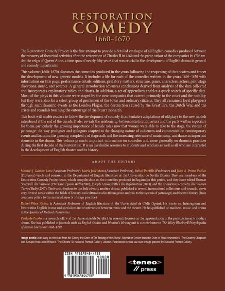 The present work is set in the context of a long-term venture: The Restoration Comedy Project, launched by a research team at the University of Seville, Spain, in 1995. This book provides an objective, detailed view of all Restoration comedies, based on the descriptive and quantitative information obtained from an analysis of the plays, taking into account the different aspects of their production, and their dual nature as literary and performance texts. Hence the following elements are considered: title-page, performance details, editions, prefatory matter, dramatic structure, genre, characters, actors, plot summary, stage directions, music, and sources. All data obtained for each individual comedy are then catalogued and subsequently incorporated into a database that is regularly updated. This book covers the years 1660-70 and is the first in a series that looks at the comedies written and/or performed in England during the period 1660-1700.