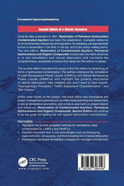 The second edition of Restoration of Contaminated Aquifers: Petroleum Hydrocarbons and Organic Compounds incorporates the latest advances in in situ remediation and natural attenuation, and maintains the comprehensive, accessible structure that made the first edition a classic. It emphasizes the remediation of Non-aqueous Phase Liquids (NAPLs), Dense Non-Aqueous Phase Liquids (DNAPLs), and the growing role of natural attenuation. The second edition features an improved introduction and new sections on site characterization, remediation economics and site closure. And unlike other books on this subject, it offers vital managerial and project management guidance.