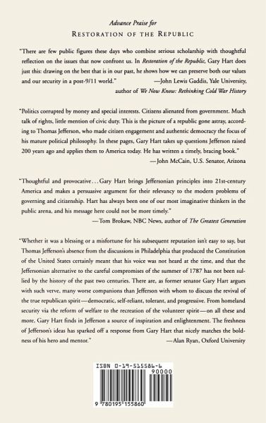 Rarely does scholarship anticipate the most dramatic events of the moment. In this timely work Gary Hart does just that, arguing for the restoration of republican virtues and for homeland security as an important first step. The American democratic republic has from its founding been a paradoxical success. Simultaneously attached to state and national power, citizens' rights and citizens' duties, American democracy has uniquely turned its reliance on consent from the governed into a powerful governing of the consenting. In a remarkable political feat, America's founders combined mixed government, the language of popular sovereignty and a self-conscious emphasis on checks and balances to forge a republic that has weathered the test of time. The complex realities of the twenty-first century, however, have fundamentally challenged the underpinnings of this enduring American experiment, repeatedly exposing the tensions at the heart of America's mixed system of government. What then is the nature of an American republic in an age of democracy? How can the democratic values of social justice and equality be balanced with republican values of civic duty and popular sovereignty? Bringing to light a long-neglected aspect of Thomas Jefferson's political philosophy--the "ward republic"--Gary Hart here offers a wholly original blueprint for republican restoration in which every citizen can participate democratically in the governing of his or her own life. Of crucial relevance for contemporary society, including its startlingly prescient plan for homeland security, Restoration of the Republic provides original insights into issues of national urgency as well as the timeless questions that bedevil the American democratic experiment.
