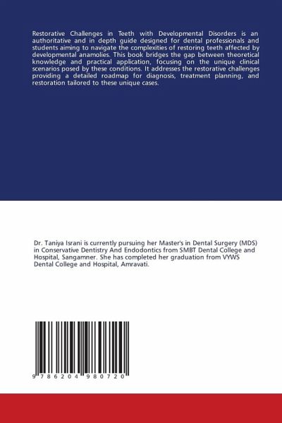Restorative Challenges in Teeth with Developmental Disorders is an authoritative and in depth guide designed for dental professionals and students aiming to navigate the complexities of restoring teeth affected by developmental anamolies. This book bridges the gap between theoretical knowledge and practical application, focusing on the unique clinical scenarios posed by these conditions. It addresses the restorative challenges providing a detailed roadmap for diagnosis, treatment planning, and restoration tailored to these unique cases.