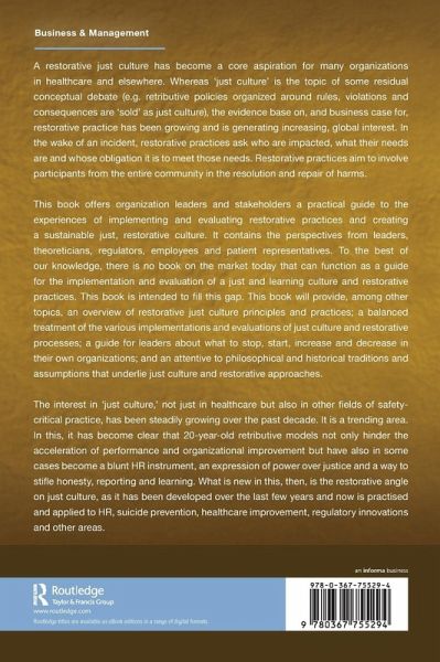 A restorative just culture has become a core aspiration for many organizations in healthcare and elsewhere. Whereas 'just culture' is the topic of some residual conceptual debate (e.g. retributive policies organized around rules,violations and consequences are 'sold' as just culture), the evidence base on, and business case for, restorative practice has been growing and is generating increasing, global interest. In the wake of an incident, restorative practices ask who are impacted, what their needs are and whose obligation it is to meet those needs. Restorative practices aim to involve participants from the entire community in the resolution and repair of harms. This book offers organization leaders and stakeholders a practical guide to the experiences of implementing and evaluating restorative practices and creating a sustainable just, restorative culture. It contains the perspectives from leaders, theoreticians regulators, employees and patient representatives. To the best of our knowledge, there is no book on the market today that can function as a guide for the implementation and evaluation of a just and learning culture and restorative practices. This book is intended to fill this gap. This book will provide, among other topics, an overview of restorative just culture principles and practices; a balanced treatment of the various implementations and evaluations of just culture and restorative processes; a guide for leaders about what to stop, start, increase and decrease in their own organizations; and an attentive to philosophical and historical traditions and assumptions that underlie just culture and restorative approaches. The interest in 'just culture', not just in healthcare but also in other fields of safety-critical practice, has been steadily growing over the past decade. It is a trending area. In this, it has become clear that 20-year-old retributive models not only hinder the acceleration of performance and organizational improvement but have also in some cases become a blunt HR instrument, an expression of power over justice and a way to stifle honesty, reporting and learning. What is new in this, then, is the restorative angle on just culture, as it has been developed over the last few years and now is practised and applied to HR, suicide prevention, healthcareimprovement, regulatory innovations and other areas.