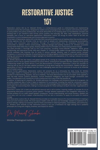 Restorative Justice 101 Restorative Justice 101 by Dr. Maxwell Shimba is a comprehensive guide to understanding and implementing restorative justice (RJ) principles. Designed for readers across all backgrounds, from students and community leaders to policymakers and justice professionals, this book demystifies RJ by breaking down its foundational concepts and showing how it can transform both formal justice systems and everyday life. With clear explanations, practical examples, and a focus on real-world applications, Restorative Justice 101 brings RJ within reach of all who are interested in a more compassionate and inclusive approach to justice. At the heart of Restorative Justice 101 is the idea that true justice should focus on healing rather than punishment. Dr. Shimba explores how RJ reframes crime as harm done to people and relationships, emphasizing accountability, empathy, and restoration over retribution. Through this transformative lens, RJ empowers individuals and communities to address conflict constructively, repairing damage and building resilience. Dr. Shimba's accessible writing makes these ideas easy to grasp, showing readers how RJ principles can create lasting positive change. The book provides a thorough look at RJ's core practices, including victim-offender mediation, family group conferencing, and restorative circles. With each chapter, Dr. Shimba guides readers through these practices, offering real-life examples that illustrate how RJ works in various settings. Whether used in criminal justice, schools, workplaces, or community disputes, RJ practices focus on bringing together all affected parties to seek understanding, healing, and solutions. Dr. Shimba's insights highlight the flexibility and adaptability of RJ, making it relevant to a wide array of situations. Dr. Shimba delves into the history and global spread of RJ, tracing its roots in Indigenous and community-based traditions and its rise as a global movement for justice reform. Drawing from examples like New Zealand's family group conferencing model and South Africa's Truth and Reconciliation Commission, Restorative Justice 101 provides an inspiring look at how RJ has been applied worldwide to bring about healing and reconciliation. Readers will gain an appreciation of how RJ can address even the most challenging cases and how it continues to evolve as an essential part of modern justice. Beyond formal applications, Restorative Justice 101 presents RJ as a philosophy for daily living. Dr. Shimba encourages readers to integrate RJ values into their personal relationships and community interactions, fostering a mindset of understanding, empathy, and accountability. The book demonstrates how RJ principles-when applied in daily life-help resolve conflicts peacefully, nurture emotional intelligence, and build stronger connections with others. This approach to RJ transforms it from a justice tool into a way of life that benefits all. In addition to exploring RJ's benefits, Dr. Shimba addresses the challenges and limitations faced by RJ programs. He provides a balanced view of what it takes to implement RJ successfully, including the need for community support, skilled facilitators, and resources. Restorative Justice 101 acknowledges these challenges while also offering strategies and insights for overcoming them, making it a practical guide for those looking to bring RJ into their organizations or communities. Restorative Justice 101 is both an educational resource and a call to action, inspiring readers to consider RJ as an empowering alternative to punitive justice systems. Through detailed explanations and thoughtful reflections, Dr. Shimba presents RJ as a path toward greater compassion, mutual understanding, and social harmony.